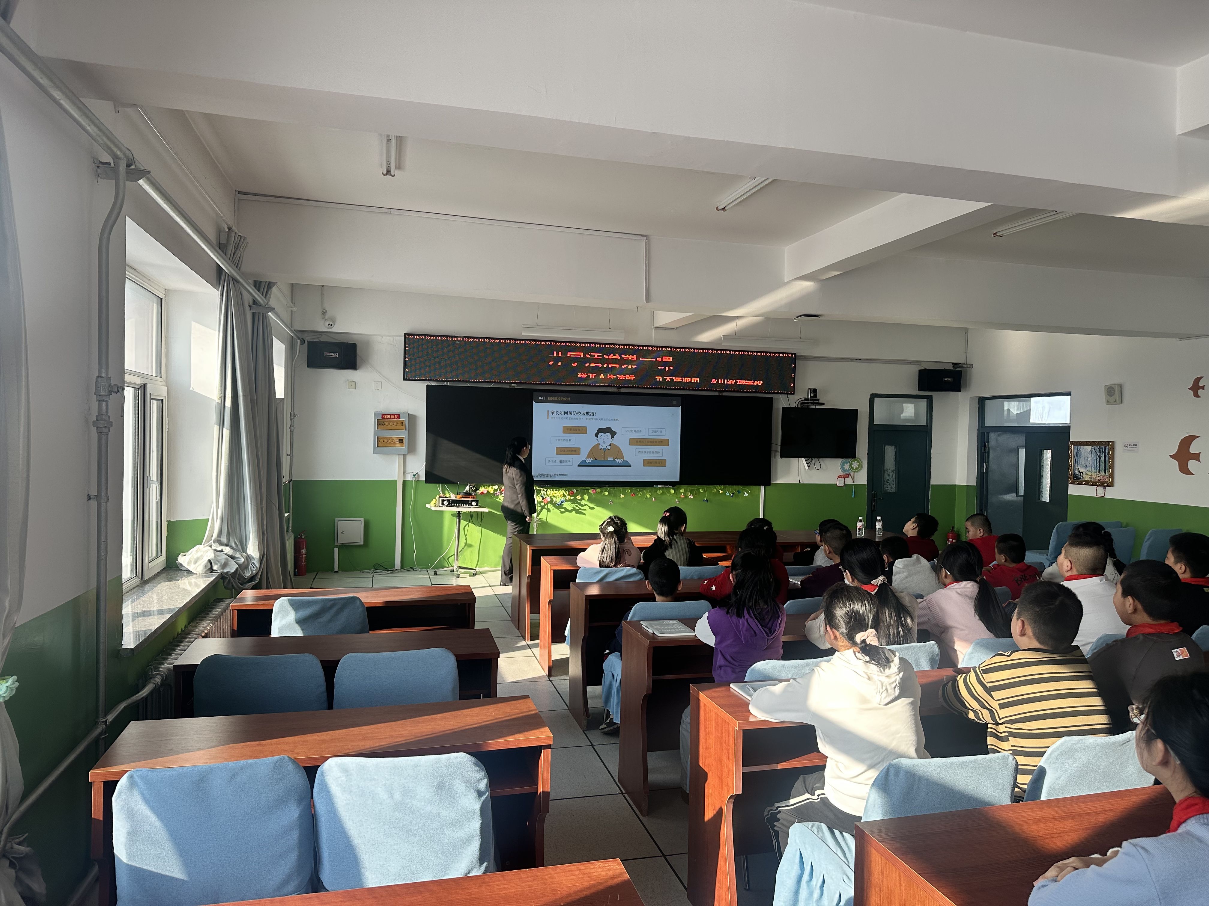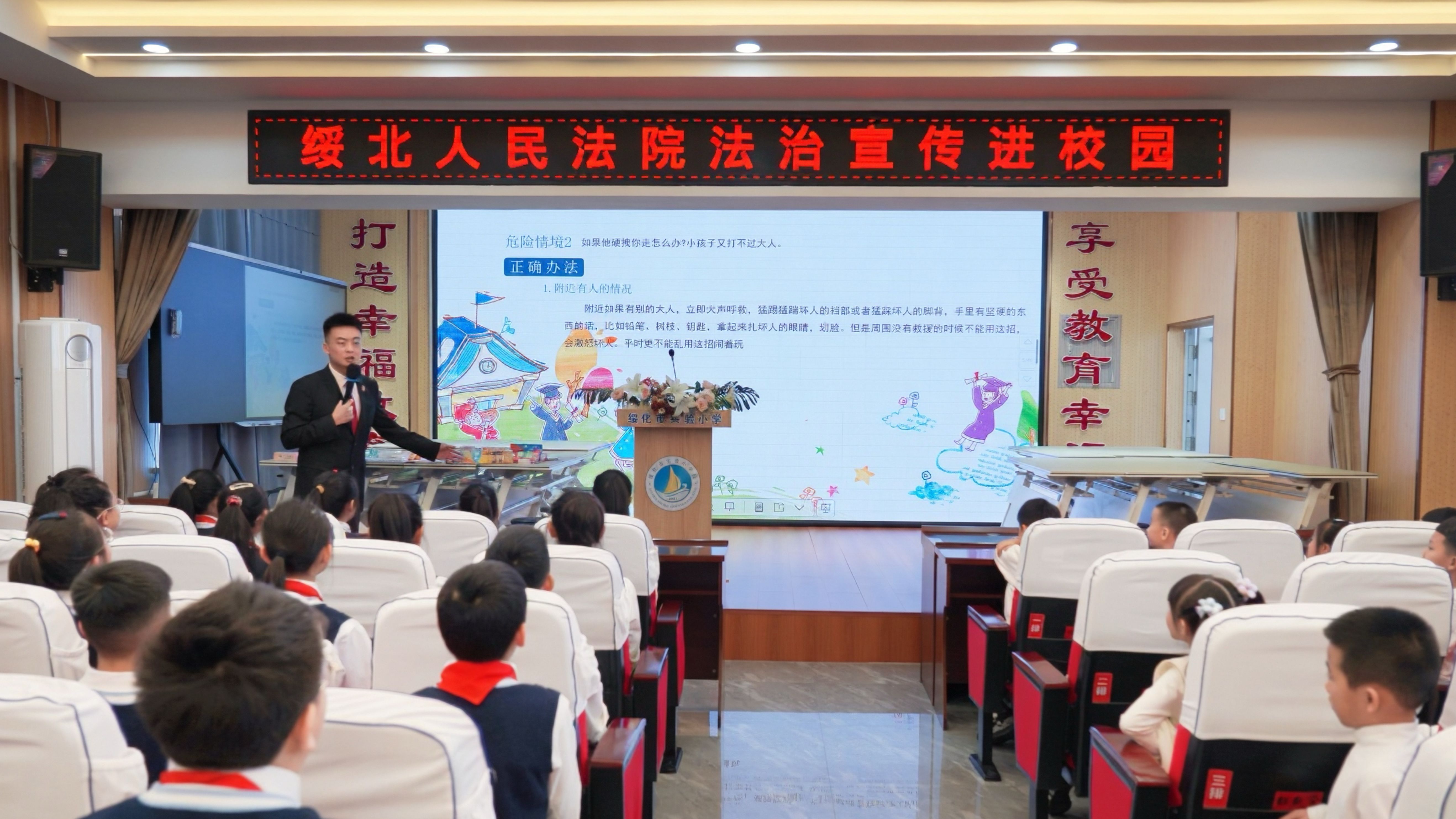 刑事审判庭干警走进绥化市实验小学开展普法宣讲活动,为师生送上一堂生动实用的法治安全教育课。干警结合小学生认知特点,用真实案例以案释法、以法析理,用通俗易懂的语言讲解法律知识,明确行为边界,引导同学们增强法治观念和自我保护意识,学会运用法律武器维护自身合法权益。同时,提醒同学们自觉抵制不良诱惑,遵守校规校纪,谨慎上网、谨慎交友,遇到危险及时向家长、老师求助,做到知敬畏、存戒惧、守底线,扣好人生第一粒“法治扣子”。
